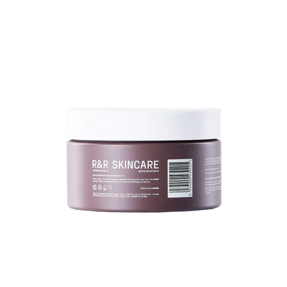 Découvrez un remède ancestral avec le beurre corporel fouetté au karité R&R, provenant du Ghana, la patrie du karité.