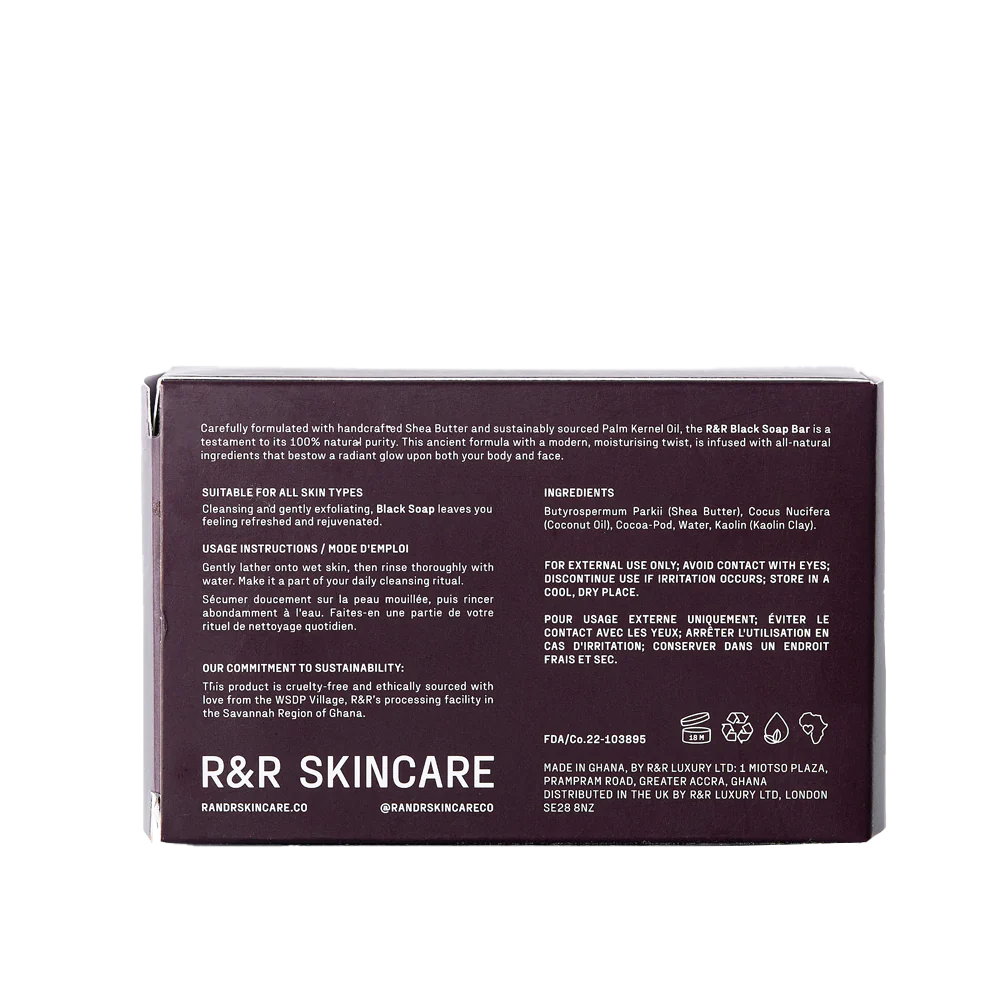 Soigneusement formulé à base de beurre de karité artisanal et d’huile de palmiste issue de sources durables, le savon noir africain R&R témoigne de sa pureté 100 % naturelle. Cette formule ancestrale, revisitée avec une touche hydratante moderne, est infusée d’ingrédients entièrement naturels qui confèrent un éclat radieux à votre corps et à votre visage.